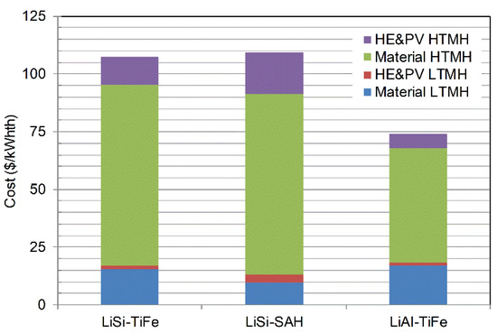 Figure 3 compares the economic performance of the three main candidate systems with the highest performance. The two LiSi systems achieve approximately the same cost (107.3 $/kWht for LiSi-TiFe and 109.2 $/kWhth for LiSi-Na3AlH6), with a difference less than 2%. The high temperature system (LiSi-SAH) employs a NaAl-based LTMH. Since the SAH material is less expensive than the Ti-based hydride, an LTMH material cost reduction of approximately 38% can be achieved. However, the LiSi-SAH system operates at higher temperature and higher pressure than the LiSi-TiFe system. Consequently, the LTMH and HTMH HE&PV costs of the LiSi-SAH system are approximately 2.4 times and 1.5 times the corresponding LiSi-TiFe costs, respectively.