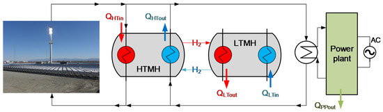 During periods of direct solar radiation, the solar thermal power, concentrated into a receiver located on top of a tower, is exchanged with a heat transfer fluid and the surplus power (QHTin in Figure 7) is stored in the TES. The concentrated solar power (QHTin) is exchanged with the HTMH, allowing the hydrogen to be desorbed (endothermic reaction) and absorbed by the coupled LTMH. As the LTMH absorbs hydrogen (exothermic process), it releases low temperature heat (QLTout in Figure 7) to be extracted from the system. When the direct radiation is not available or additional energy is required to run the power plant, the process is reversed. Providing low temperature thermal power into the LTMH (QLTin in Figure 7), hydrogen flows from the LTMH and is absorbed by the HTMH exothermally. This reverse process allows high temperature heat (QHTout in Figure 7) to be exchanged with the heat transfer fluid and run the power plant continuously. The hydrogen is exchanged between the two hydrides through a temperature-swing process, which creates the required small pressure changes for hydrogen flowing, without any mechanical-electric compression [10]. Depending on the specific configuration, a totally thermally self-sustaining configuration can also be achieved, reusing the power plant waste heat (QPPout) to provide the required heat to drive the hydrogen desorption from the LTMH (QLTin) [16].