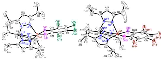 The coordination geometry around the copper(II) ion in [Cu(catCl4)(L1′)] and [Cu(catBr4)(L1′)] is essentially a five-coordinate square-pyramidal geometry with the basal plane comprising two nitrogen atoms (N11 and N31) from tris(pyrazolyl)methane and two oxygen atoms (O40 and O45) from catechol and whose axial site is occupied by the remaining nitrogen atom (N21) (Figure 1). This coordination geometry is supported by the structural parameter τ5 values (0.02 in [Cu(catCl4)(L1′)] and 0.03 in [Cu(catBr4)(L1′)]) [38]. The apical deviation of the copper(II) ion from the corresponding least-squares N2O2 basal plane is 0.15 Å in [Cu(catCl4)(L1′)] and 0.17 Å in [Cu(catBr4)(L1′)]. The averaged Cu–O distances of 1.919(2) Å in [Cu(catCl4)(L1′)] and 1.917(3) Å in [Cu(catBr4)(L1′)] and the averaged C–O distances of 1.317(3) Å in [Cu(catCl4)(L1′)] and 1.318(4) Å in [Cu(catBr4)(L1′)]. In general, the C–O bond distances in catCl42− (3,4,5,6-tetrachlorocatecholate) and sqCl4●− (3,4,5,6-tetrachloro-o-semiquinate) fall into the range of 1.30–1.36 Å and 1.26–1.31 Å, respectively (Table 1). Therefore, the coordinated catechol group in [Cu(catCl4)(L1′)] and [Cu(catBr4)(L1′)] is best described as catX42−, rather than either sqX4●− or qX4 ((3,4,5,6-tetrahalogeno-o-quinone) (Scheme 1), and both copper are divalent. This oxidation assignment is consistent with the data of d-d transitions in UV-Vis spectra and ESR parameters in ESR spectra (vide infra). The dihedral angle between apical pyrazole and catechol ring is 99.3° in [Cu(catCl4)(L1′)] and 90.0° in [Cu(catBr4)(L1′)]. Therefore, the apical pyrazole locates in a nearly vertical position.