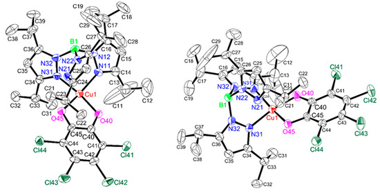 Crystal structure of [Cu(catCl4)(L1H)] showing 50% displacement ellipsoids and the atom labeling scheme (left: top view, right: side view). Hydrogen atoms were omitted for reasons of clarity. Relevant bond lengths (Å) and angles (°): Cu1–N11, 1.976(5); Cu1–N31, 1.973(5); Cu1–O40, 1.890(4); Cu1–O45, 1.952(4); C40–O40, 1.336(8); C45–O45, 1.334(6); C40–C45, 1.412(8); N11–Cu1–N31, 91.2(2); N11–Cu1–O40, 96.1(2); N31–Cu1–O40, 169.3(2); N11–Cu1–O45, 159.1(2); N31–Cu1–O45, 89.36(19); O40–Cu1–O45, 86.61(17).