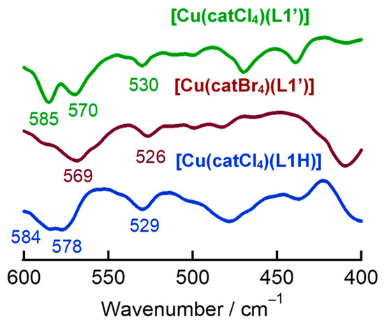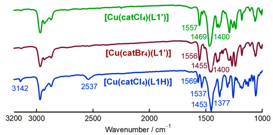 IR spectra of the three catecholato complexes were measured using KBr pellets as shown in Figure 3. One typical C=N stretching vibration in both [Cu(catCl4)(L1′)] and [Cu(catBr4)(L1′)] complexes was shifted to 1557 and 1556 cm−1 from the corresponding L1′ ligand at 1553 cm−1, respectively [9]. Coordinated catechols typically show two strong stretching bands attributed to the ring stretching (ν(C–C)) and the CO group stretching (ν(C–O)) around ~1500 cm−1 and ~1350 cm−1, respectively [46,47,48,49,50]. In the L1′ complexes [Cu(catCl4)(L1′)] and [Cu(catBr4)(L1′)], two broad characteristic bands were observed at 1466 and 1400 cm−1, corresponding to the ring stretching (ν(C–C)) and the CO group stretching (ν(C–O)), respectively. In the L1− complex [Cu(catCl4)(L1H)], the ν(C=N) band split to 1569 and 1537 cm−1 due to different pyrazole ring environment. Intensity and stretching energy indicate that former is derived from the protonated pyrazole ring. Catechol ring stretching was also observed at 1453 and 1377 cm−1. Moreover, the ν(N–H) band was observed at 3142 cm−1. This is the first observation of the protonated pyrazole by IR spectroscopy.
