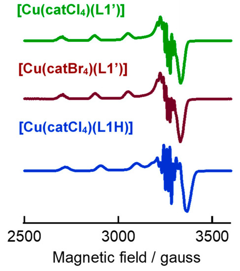 The frozen glass ESR spectra of the complexes at 137 K are presented in Figure 6. The ESR spectra show that these complexes have an S = 1/2 ground state. The order of g|| > g⊥ > 2.0023 is satisfied in all the complexes, confirming the presence of unpaired electron of the copper(II) ion in dx2−y2 orbital. These observations are consistent with the above consideration that catechol is coordinated as catecholate two minus anion. Some differences in the ESR parameters in all the complexes are caused by different coordination geometries: five-coordinate square-pyramidal and four-coordinate square-planar. The ESR parameters of the reported Cu(II)-catBu2 or Cu(II)-catCl4 complexes are also consistent with an S = 1/2 ground state [27,28,29,30,33]. On the other hand, the reported magnetism of Cu(II)-sqBu2 or sqCl4 complexes are diamagnetism (ESR silent) [27,33,34,36,37] or ferromagnetism [35].