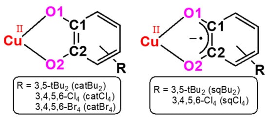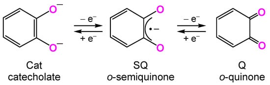 In this research, we expanded our copper(II) coordination chemistry toward catecholato complex, since the interaction between copper and catechol has been reported in copper-containing proteins such as catechol oxidase and tyrosinase [13,14,15,16]. Moreover, catechol itself is known as “non-innocent” ligand [17,18,19,20,21,22,23,24] and is a redox active ligand that reversibly undergoes one-electron sequences illustrated in Scheme 1.