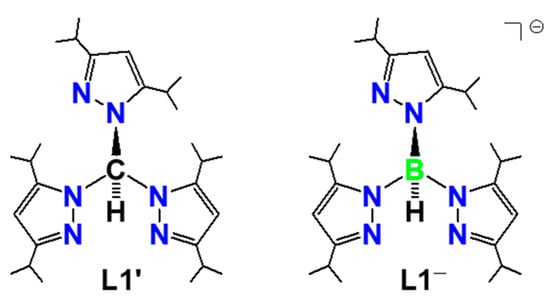 By using these ligands of L− (hydrotris(pyrazolyl)borate) and L’ (tris(pyrazolyl)methane), structural differences in chlorido and nitrato copper(II) complexes were observed: neutral four-coordinate [CuCl(L)] versus neutral five-coordinate [CuCl2(L’)] [8], neutral four-coordinate [CuCl(L)] versus cationic four-coordinate [CuCl(L’)](ClO4) [10], mononuclear [CuCl(L)] versus binuclear [Cu(μ-Cl)(L’)]2(ClO4)2 [11] and bidentate [Cu(κ2-O2NO)(L)] versus monodentate [Cu(κ-ONO2)2(L’)] [8,12], and their different electron donation properties in copper(I) carbonyl complexes: [Cu(CO)(L)] (ν(CO), 2056 cm−1) versus [Cu(CO)(L’)](PF6) (ν(CO), 2107 cm−1) [9].