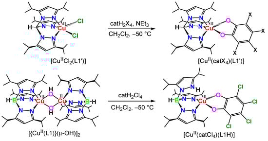 Crystal data and refinement parameters for the three catecholato copper(II) complexes [Cu(catCl4)(L1′)]·2.5(CH3CN), [Cu(catBr4)(L1′)]·2.5(CH3CN), and [Cu(catCl4)(L1H)] are given in Table 2. All crystallographic data have been deposited at the CCDC, 12 Union Road, Cambridge CB2 1EZ, UK and copies can be obtained on request, free of charge, by quoting the publication citation and the deposition numbers. CCDC numbers: 620467 for [Cu(catCl4)(L1′)]·2.5(CH3CN), 620468 for [Cu(catBr4)(L1′)]·2.5(CH3CN), and 620469 for [Cu(catCl4)(L1H)] (CIF and the checkCIF output files can be found at Supplementary Materials).
