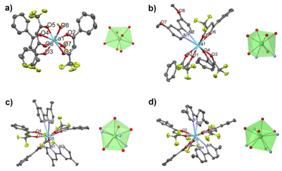 Partially labelled molecular plots and coordination figures of the title complexes 1–10 are presented in Figure 1, Figure 2 and Figure 3 and main bond parameters are summarized in Table S1, respectively. Each La(III) center of the neutral and monomeric complexes 1–8 are ligated by six oxygen donor atoms of three btfa β-diketonato ligand anions. Coordination number 8 in 1 is achieved by two oxygen atoms of terminal aqua ligands, and in 2 by the two N-donor atoms of the 4,4′-Mt2bipy chelating ligand. Their La-N/O bond lengths vary in the range from 2.407(3) to 2.6690(14) Å. The coordination number ten around La1 in 3 and 4 is completed by 4 nitrogen donor atoms of two chelating 4,4′-Me2bipy and 5,5′-Me2bipy ligands, respectively. Their La-N/O bond distances are in the range from 2.4911(14) to 2.8637(18) Å.