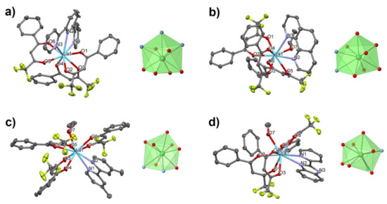 The interaction of Ln(NO3)3·6H2O (Ln = La(III) or Tb(III)) with 4,4,4-trifuoro-1-phenylbutane-1,3-dione (Hfta) in ethanol, methanol and/or mixed ROH-acetone and Et3N or NaOH in the stochiometric ratio 1:3:3 afforded the neutral mononuclear tris(β-ketonato) compounds, where in the presence di-nitrogen donor or terpy ligands allow the central Ln(III) ions display a variety of CN (8–10) and geometries: [La(btfa)3(4,4′-Mt2bipy)] (2), [La(btfa)3(4,4′-Me2bipy)2] (3), [La(btfa)3(5,5′-Me2bipy)2] (4), [La(btfa)3(terpy)] (5), [La(btfa)3(phen)(EtOH)] (6), [La(btfa)3(4,4′-Me2bipy)(EtOH)] (7), [La(btfa)3(2-benzpy)(MeOH)] (8) and [Tb(btfa)3(4,4′-Me2bipy)] (9). When excess Hfta is used, the tetrakis(β-ketonato) anionic complex (Hpy)[Eu(btfa)4] (10) was isolated. This trend in reactions of Ln(III) salts and β-diketonate derivatives seems to be universal, where many compounds and pyridyl adducts of similar structural formulas have been isolated and structurally characterized [24,25,26,31,57,58,59,60,61].