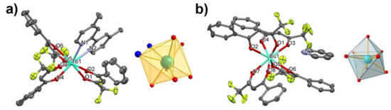 - Mara, D.; Artizzu, F.; Laforce, B.; Vincze, L.; Van Hecke, K.; Van Deun, R.; Kaczmarek, A.M. Novel tetrakis lanthanide β-diketonate complexes: Structural study, luminescence properties and temperature sensing. J. Lumin. 2019, 213, 343–355. [Google Scholar] [CrossRef]