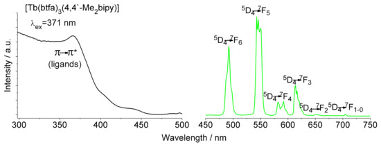 The photoluminescence of 9 and 10 was measured in the solid state at room temperature. For Compound 9 (Figure 4) the spectrum shows an intense and broad band with two peak maxima at 300 and 371 nm corresponding to the π→π* transitions of 4,4′-Me2bipy and btfa− ligands, respectively [36]. The excitation wavelength for the emission spectrum (λem) is 371 nm. The first emission peak at 492 nm could be attributed to 5D4→7F6 transition, whereas the most intense band located at 543 nm is attributed to 5D4→7F5 transition. These were followed by another three peaks at 593, 614 and 650 nm, which could be assigned to 5D4→7F4, 5D4→7F3 and 5D4→7F2 transitions, respectively. Moreover, the very weak bands observed around 700 nm can be assigned to the 5D4→7F1 and 5D4→7F0 transitions [37,38,39].