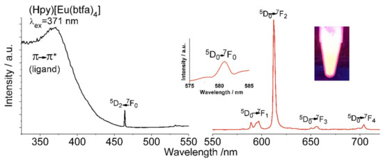 For compound 10 (Figure 5), the excitation spectrum monitored at 613 nm (5D0→7F2) reveals an intense broad band at 371 nm due to the π→π* transition from the coordinated btfa− ligands to the Eu(III) ion. In addition, the narrow, which was observed at 464 nm is assigned to 7F0→5D2 f-f transition from the central europium ion [40]. Emission spectrum of 10 (Figure 5) recorded at excitation wavelength λex = 371 nm exhibits the characteristic bands that arise from Eu(III) f-f transitions. At 580 nm (Figure 5, inset left), 5D0→7F0 transition appeared as the weakest intense peak. Furthermore, the pure magnetic dipole transition 5D0→7F1 at 591 nm, in which its intensity is practically independent of the Eu3+ environment, is divided into two components due to crystal field splitting of the 7F1 level [41]. the emission spectra of 10 is revealing four main bands at 591 (5D0→7F1), 613 (5D0→7F2), 656 (5D0→7F3) and 704 (5D0→7F4) [31,40,42]. The emission peak centered at 613 nm, which is the strongest peak and corresponds to the hypersensitive band 5D0→7F2 is the one responsible for the observed emission color of the sensitized europium compound. The intensity ratio between 5D0→7F2 and 5D0→7F1 is 5.45 is indicating that the emission color is shifted to the orange range and the Eu(III) ion is not placed in a position with inversion symmetry according to the coordination geometry obtained from the SHAPE measurement (TDD8-D2d) [43]. In addition, the emission spectrum was recorded at λex = 464 nm (5D2←7F0) (Figure S21). The luminescence spectrum showed the same characteristic bands from the europium ion when excited at the longer wavelength with a measured luminescence Quantum Yield (QY) in the solid state of 14.82% proposing the possible use of the compound for biomedical applications.