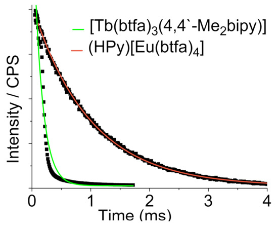 where ITOT/IMD is the ratio of integrated area of 5D0 emission bands from the corrected emission spectra to the pure magnetic dipole 5D0→7F1 integrated emission band and and are a constant equal to 14.65 s−1 and the refractive index in where the sample is measured (1.517 for solid state), respectively, [40,47]. The obtained results agree with other Eu(III) [31,32,36,48] and Tb(III) [49,50] β-diketonate compounds.