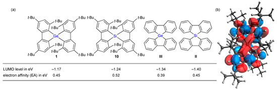 (a) Theoretically calculated LUMO levels and electron affinity (EA in eV) values for Si- and Ge-spirobifluorenes II, III, 1 and 10. (b) LUMO of 1; all calculations were carried out at the B3PW91-D3(BJ)/6-311G(2d,p) level of theory.