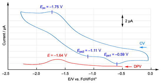 Cyclic (blue) and differential-pulse (red) voltammograms of spirogermabifluorene 1 in THF at −40 °C ([1]: 1.0 mM; supporting electrolyte: 0.1 M [nBu4][PF6]; scan rate: 70 mVs−1).