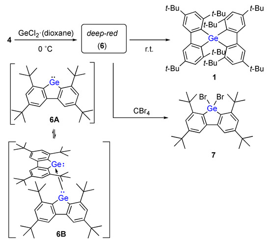 Although the mechanism of the reaction of 4 with GeCl2·(dioxane) to furnish spirogermabifluorene 1 is not clear in all details at present, the formation of 1 can potentially be explained in terms of a disproportionate reaction of germylene-dimer 6B, i.e., from Ge(II) to Ge(IV) and Ge(0). On the basis of DFT calculations at the B3PW91-D3(BJ)/6-311G(2d,p) level of theory for the real models, a plausible reaction pathway is proposed in Scheme 3 [30].