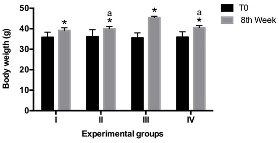 Weight of the mice per group. The weight at the beginning (Time 0) compared to the end of the experiment (8th week) was different. In group III (vanadium) the weight gain was higher than in the other groups. N = 10, values are expressed as the mean of body weight ± SEM in grams (ANOVA p ≤ 0.05 Tukey’s post hoc).* statistically significant differences vs. T0; a: statistically significant differences versus group III 8th week.