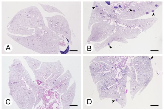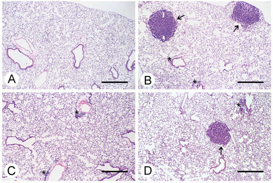 Panoramic photomicrographs show the presence of pulmonary adenomas in mice treated with urethane, i.e., groups II and IV (Figure 2B,D, respectively). Groups I and III did not develop lung adenomas (Figure 2A,C, respectively).