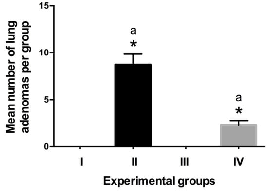 Quantitation of developed adenomas per group. No tumors were observed in group I (control) and group III (vanadium). In group II (urethane), the tumors were larger than in group IV (urethane-V group). N = 10, values are expressed as the mean number of adenomas ±SEM (ANOVA p ≤ 0.05 Tukey’s post hoc). * Statistically significant differences versus group I; a: statistically significant differences between group II and IV.