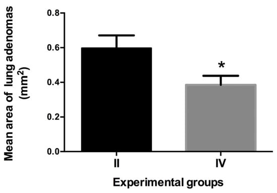 Area (mm2) occupied by lung adenomas. In group II (urethane) the adenomas were larger compared with those observed in group IV (urethane-V). N = 10, values expressed as the mean area ± SEM (two-tailed Student’s t-test with Welch’s correction, p ≤ 0.05). * Statistically significant differences between group II versus group IV.