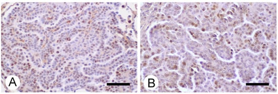 Immune stain for PCNA in lung adenomas. Positive PCNA nuclei (ochre color) were observed in urethane (A) and urethane-V (B) with no statistical difference between them. Hematoxylin counterstain. Bar 50 µm.