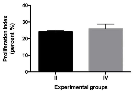 Proliferation index. The index indicated that between groups II and IV, no statistical difference was observed. N = 10, values expressed as mean percentage of PCNA positive nuclei ± SEM (two-tailed Student’s t-test with Welch’s correction). No statistically significant differences were observed.