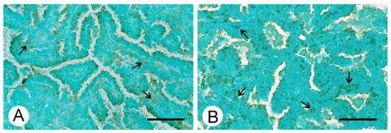 TUNEL immuno-essay. Positive nuclei TUNEL stain (ochre color) were observed in urethane group (A) and urethane-V group (B) (↑). Light green counterstain. Bar 50 µm