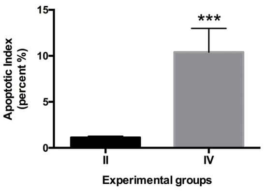 Apoptotic index. The index was higher in group IV (urethane-V) compared with group II (urethane). N = 10, values are expressed as mean percentage of TUNEL positive nuclei ± SEM (two-tailed Student’s t-test with Welch’s correction p ≤ 0.05). *** Statistically significant differences between group II versus group IV.