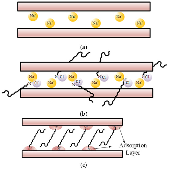 In this study, an intercalation agent was used to modify the nano-MMT particle surface. The experimental steps are as follows: First, the original MMT particles were added to distilled water, stirred to form a suspension, and then, STAC was added to this solution and stirred under at 80 °C for 2 h. A filter flask was used for decompression, and a core funnel was used to filter the mixture. Subsequently, a 1% silver nitrate solution was slowly added to the mixture to remove white sediment. Once the white sediment was removed completely, we stopped adding the silver nitrate solution. Finally, the mixture was dried in a vacuum drier. After carefully grinding the dried mixture, nano-MMT particles with surface modification were prepared. Figure 1 presents a schematic of nano-MMT particle surface modification by the intercalation agent.