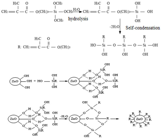 SCA was used in a similar manner to modify nano-ZnO particle surfaces. Specifically, first, absolute alcohol and distilled water were mixed. The original nano-ZnO particles were added to the mixture. After ultrasonic concussion for 1 h, the mixture was stirred under a constant temperature of 80 °C for 2 h. Subsequently, SCA was slowly added to the mixture. The filter flask was used for decompression, whereas the core funnel was used to filter the mixture. Then, the filtered material was dried. After carefully grinding the dried mixture, the nano-ZnO particles with surface modification were prepared. Figure 2 illustrates the surface modification mechanism by the SCA.