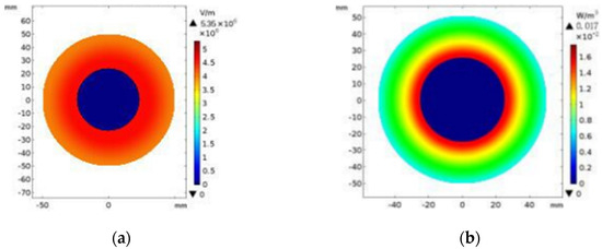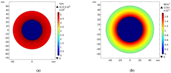 Detection chart of LDPE insulation: (a) electric field distribution of LDPE; (b) dielectric loss density of LDPE.