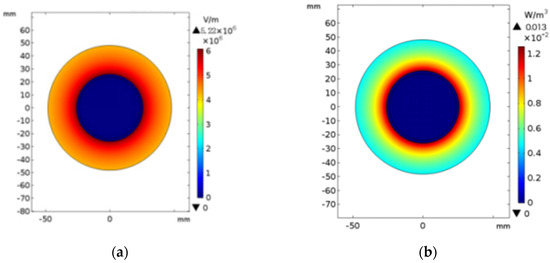 The internal electric field distribution contours and dielectric loss density map of the simulation cables with nano-MMT/LDPE insulation material are shown in Figure 6.