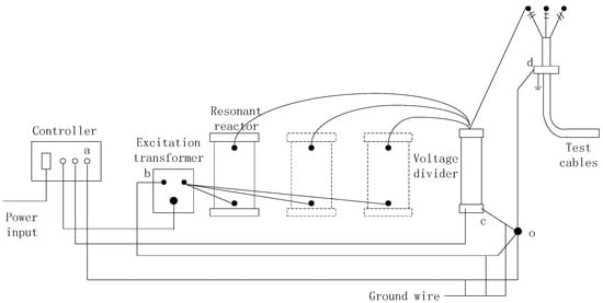 In cable thermal breakdown condition testing, a high-voltage stable power supply is required. In this study, a series of resonant equipment was selected, and the testing environment was relatively simple and safe. By adjusting the power frequency, resonant reactor, and capacitor, resonance phenomena occurred, from which a high-voltage current emerged in the detected cables. The main experimental devices of the series resonant equipment included a frequency and voltage modulation power supply, a capacitive voltage divider (CVD), an excitation transformer, and an electric reactor. The wiring diagram of cables powered by the series resonant equipment is shown in Figure 8.