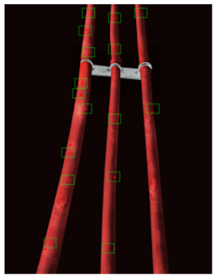 The insulation materials of the three cables in the fixture were pure LDPE, nano-MMT/LDPE, and nano-ZnO/LDPE, from left to right. From the infrared images of the cables, anomalous temperature points were observed in all tested cables. This is because the dielectric loss of the materials decreased the conductivity. The heat could not be rejected in a timely manner; therefore, electrical trees appeared in the insulation materials, which caused thermal distortion. The external layer of the cables was continually heated. The infrared images of the cables were processed using MATLAB. With grey value changes, the Thompson points in the infrared images were the temperature anomalous points. Figure 10 presents the infrared detection results of the temperature anomalous points.