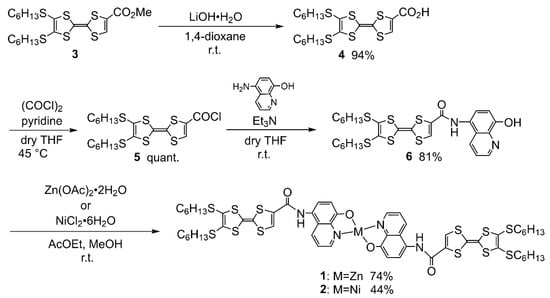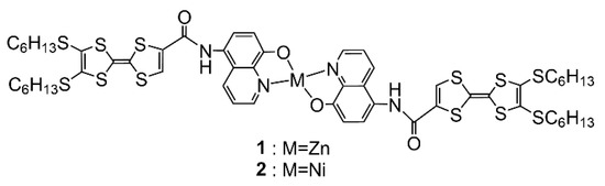 Synthesis of transition metal complexes 1 and 2 was performed according to Scheme 1. Thus, TTF derivative 3 containing one methoxycarbonyl group and two n-hexylthio groups was synthesized by following the reported method [25]. We introduced two n-hexylthio groups to improve the solubility of the target complexes 1 and 2. Compound 3 was hydrolyzed into the corresponding carboxylic acid 4 using an excess of lithium hydroxide monohydrate in 1, 4-dioxane at room temperature [26]. Then, carboxylic acid 4 was converted into its acid chloride 5 by the reaction with oxalyl chloride and a catalytic amount of pyridine in THF [27]. Ligand 6, containing an 8-hydroxyquinoline part, was obtained in 81% yield by the reaction between 5 and 5-amino-8-hydroxyquinoline hydrochloride in the presence of triethylamine in dry THF at room temperature [28]. The target transition metal complexes 1 (M = Zn) and 2 (M = Ni) were prepared by the reaction of ligand 6 with the corresponding metal compounds, zinc (II) acetate dihydrate or nickel (II) chloride hexahydrate in the mixture of methanol and ethyl acetate at room temperature in 74% and 44% yields, respectively.