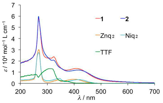 UV-Vis absorption spectra were measured using 10–4 M DMF solutions at room temperature as shown in Figure 1. As well as the case of Znq2 and Niq2, complexes 1 and 2 containing TTF parts also showed almost the same spectra to each other, and gave strong and sharp absorption maxima at 268 nm and small absorption maxima around 410 nm, which just correspond to those of Znq2 (λmax = 268 nm, 400 nm) and Niq2 (λmax = 268 nm, 416 nm) (see Table 2). Furthermore, weak maxima around 320 nm corresponding to that of TTF (λmax = 312 nm) were also observed in complexes 1 and 2. On the other hand, although Znq2 and Niq2 showed absorption tails up to around 470 nm, complexes 1 and 2 exhibited their absorption tails up to a much longer wavelength region of around 700 nm, which suggests the appearance of a charge transfer (CT) absorption band from the TTF to Mq2 parts and is preferable for the photo-electric conversion by visible light. Emission spectra of the 10–6 M CHCl3 solution of complexes 1 and 2, Znq2 and Niq2 were measured at room temperature under identical conditions (see Supplementary Materials Figure S1). When the solutions of these complexes were irradiated by an excitation light of 268 nm that corresponds to their absorption maxima (strong π–π* transitions of the Mq2 part), strong fluorescences were observed at around 404 nm. The intensities of fluorescences of complexes 1 and 2 were of almost the same degree as the corresponding Mq2 (M = Zn, Ni) complexes, suggesting that almost no suppression of fluorescence occurred due to weak intramolecular CT interaction between the TTF and Mq2 complex parts.