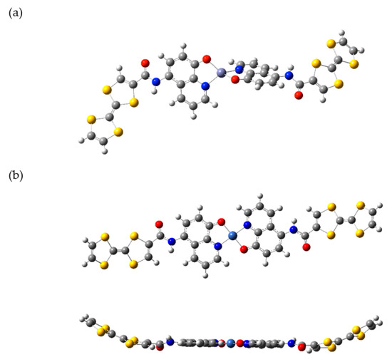 Because single crystalline samples of complexes 1 and 2 were not obtained, molecular structures of these complexes in their isolated states are estimated by the DFT calculation at the B3LYP level using the LANL2DZ basis set for the central zinc and nickel atoms and the 6–31G(d, p) basis set for the other atoms (GAUSSIAN 09 package), as shown in Figure 2 [29]. In the optimization of molecular structures, the n-hexylthio substituents on the TTF part are removed. The optimized molecular structure of Zn complex 1 shows distorted tetrahedral coordination around the central zinc atom with a dihedral angle of 85.1° between two 8-quinolinato ligands. Therefore, two TTF-8-quinolinato ligands are largely twisted to each other on the central zinc atom. Furthermore, the dihedral angles between the 1,3-dithiole rings that connect to the amide bond and 8-quinolinato parts are 20.1° and 49.7°, suggesting that the intramolecular interaction between the TTF part and Znq2 part may be weakened by these twisted structures around the amide bonds. Such a largely twisted structure of the amide-containing TTF-N-heterocyclic ligand was reported in the bipyridine derivative (dihedral angle: 38.9°) [28]. On the other hand, Ni complex 2 shows square-planar coordination around the central nickel atom and the Niq2 part has almost complete planarity, as shown in Figure 2b. Such a planar structure has been reported in bis(7-isopropyl-8-quinolinato)nickel(II) complex and bis-(4-methylpyridine)bis(8-quinolinolato)nickel(II) complex [30,31]. Because the dihedral angles between the 1,3-dithiole rings that connect to the amide bond and 8-quinolinato parts are calculated to be 8.6° and 11.6° in complex 2, the intramolecular interaction between the TTF and Niq2 parts is considered to be stronger through more planar structures of TTF-8-quinolinato ligands around the amide bonds than Zn complex 1. Such a relatively planar structure of the amide-containing TTF-N-heterocyclic ligand was also reported in the symmetric D-A-D type bipyridine derivative (dihedral angle: 9.6°) [28]. These deviations about the dihedral angles between the 1,3-dithiole rings and N-heterocyclic parts suggest the structural flexibility around the amide bond.