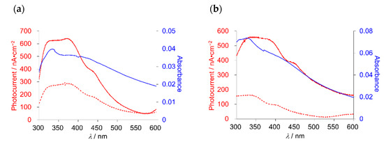 Photocurrent action spectra under the bias voltage vs. Ag/AgCl reference electrode (red solid line: −0.2 V, red dashed line: 0 V vs. Ag/AgCl) and absorption spectra (blue line) of the thin film samples of (a) Zn complex 1 and (b) Ni complex 2 prepared by a casting method on the ITO electrodes.