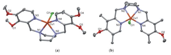 The X-ray crystallography of the previously determined chlorido complex, [Cu(L1)Cl]ClO4, and its corresponding acetonitrile complex, [Cu(L1)(CH3CN)](PF6)2 revealed that these molecules adopt square-pyramidal geometries [6,45].