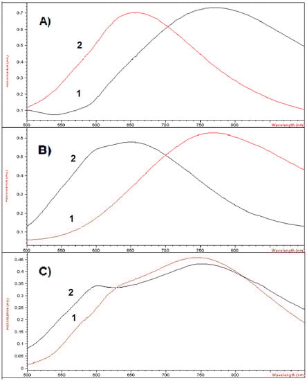 Visible spectra of (A) 1.14 × 10−3 M of [Cu(L1)Cl]PF6 (1-Cl), (B) 8.87 × 10−4 M of [Cu(L4)Cl]ClO4·H2O (4-Cl), and (C) 8.00 × 10−4 M of [Cu(L3)ClO4]ClO4 (3-ClO4) in CH3CN (1) and CH3CN/H2O (1:1 by volume) (2) solutions.