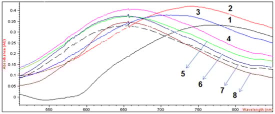 Spectrophotometric titration of [Cu(L1)Cl]PF6 (1-Cl) (5.06 × 10−4 M) in aqueous acetonitrile solutions at room temperature. The H2O/CH3CN volume ratios were as follows: (1) 0/10, (2) 0.3/9.7, (3) 0.6/9.4 (4) 1.5/8.5, (5) 2.0/8.0, (6) 2.6/7.4, (7) 3.3/6.7, and (8) 4.0/6.0.