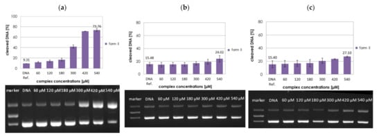 For analysis, 1.5 µL of loading buffer (3.7 mM bromophenol blue and 1.2 M saccharose in deionized water), was added and the sample was loaded onto the gel. Electrophoresis was carried out at 40 V for 2 h at room temperature using an electrophoresis unit (Carl Roth) in 0.5× TBE buffer. Bands were visualized using fluorescence emission of ethidium bromide and photographed using a gel documentation system (Bio-Rad, Gel Doc™ EZ imager). DNA bands were quantified using Bio-Rad Laboratories Image Lab Software 5.2.1. In all assays, the intensity of the bands was measured using a reference DNA sample (no complex added) as standard. Taking into account that the supercoiled form I of plasmid DNA has a smaller affinity to bind ethidium bromide, its intensity was multiplied with a correction factor of 1.22 [59]. The average of results for each concentration was related to the DNA reference in percent. The statistical analysis was carried out with Microsoft Excel 2010. The DNA marker consisted of 50% purified, linearized (by EcoRI nuclease) and 50% nonlinearized plasmid pBR322 DNA.