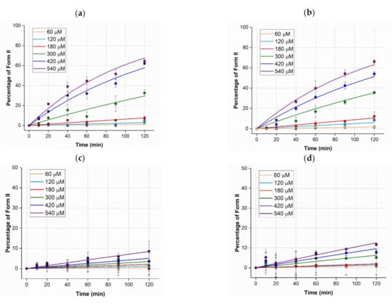 Plot of the percentage of form II vs. incubation time for the cleavage of pBR322 plasmid DNA (0.025 µg/µL) by complexes: (a) 1-ClO4, (b) 1-Cl, (c) 2-ClO4, and (d) 3-ClO4, at varying concentrations (0–540 µm), pH 7.4 (10 mm MOPS buffer), and 37 °C. The plots show the fitted function (Equation (1)) used to determine the observed rate constant, kobs at each complex concentration.