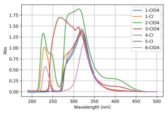 In contrast, the dissolution of the perchlorato or the chlorido complexes, [Cu(L)X]ClO4/PF6 (X = ClO4− or Cl−) in aqueous acetonitrile solutions is instantaneously associated with color change from teal or blue to aqua blue or cyan, and this process is accompanied by a blue shift in the visible region. Some examples are represented in Figure 2 in CH3CN and CH3CN/H2O (1:1 by volume) solutions. Interestingly, the original molar conductivity values of the perchlorato complexes, [Cu(L)ClO4]+, which were measured in pure CH3CN (300–310 Ω−1·cm2·mol−1), decrease in aqueous acetonitrile solutions to 180–213 Ω−1·cm2·mol−1 with limiting values; slightly bigger than typical values for 1:1 electrolytes and much smaller than predicted for 1:2 electrolytes. In addition, the chlorido complexes, [Cu(L)Cl]+, in aqueous acetonitrile behave in a similar way, except their molar conductivity values were a little bit higher (Table 1).