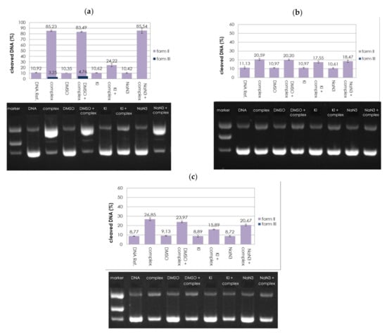 Cleavage of pBR322 plasmid DNA (0.025 µg/µL) by complexes (540 µm): (a) 1-ClO4, (b) 2-ClO4, and (c) 3-ClO4 after an incubation time of 2 h at 37 °C in the presence and absence of ROS scavengers (0.4 M DMSO, 500 µM KI, 500 µM NaN3) in MOPS buffer (10 mM, pH 7.4).