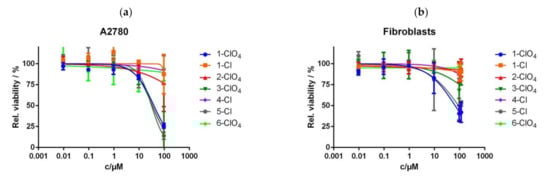 Ligand L3, which shows slight DNA cleavage, was the only ligand to exhibit cytotoxicity—but only in the cancer cells (77.3 µM, in fibroblasts > 100 µM). This suggests that the ligand might also be involved in the high cytotoxicity of complex 3-ClO4 in A2780 cells. Cell uptake of metal complexes, which is an important prerequisite for their cytotoxicity, is usually dependent on their lipophilicity [57], and the quinoline-based ligand L3 is supposed to be more lipophilic than the pyridine-based ligands. Selectivity for certain cell lines has been observed before for quinoline-derived compounds [58].