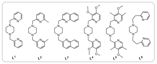In brief, 6-methyl-2-pyridinemethanol was converted into 6-methyl-2-chloromethylpyridine hydrochloride with the aid of SOCl2 in CHCl3, followed by recrystallization from ethanol. Further, 1,4-bis[(2-pyridinyl)methyl]piperazine (L1) and 1,4-bis[(2-pyridinyl)-(2-ethyl)]piperazine (L6) were prepared according to the published literature [6,47]. The compounds L2–L5 were synthesized as follows: