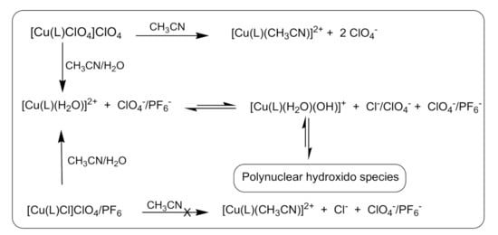 Proposed solvolysis and aquation reactions of [Cu(L)X]ClO4/PF6 complexes (X = Cl− or ClO4−; L = L1–L5) in acetonitrile and aqueous acetonitrile solutions.