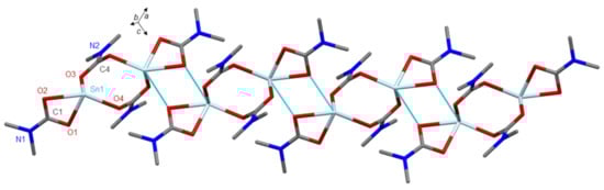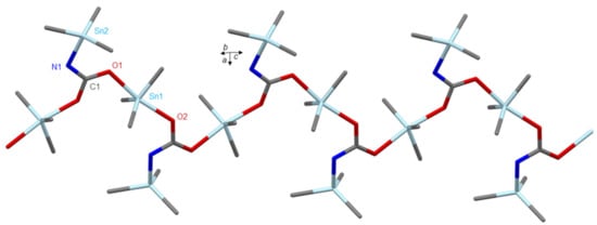 The first X-ray crystallographic investigation on a tin complex bearing a carbamato ligand was reported by Zakharov et al. in 1980, as part of studies on organotin isocyanate derivatives []. Thus, the Russian group characterized at the solid-state the structure of the trimethyltin(IV) ester of N-trimethylstannylcarbamic acids, Me3SnNHC(=O)–OSnMe3 (1), which describes a polymeric arrangement displaying a zigzag one-dimensional infinite chain along the c-axis (Figure 1). The organization of 1 consists of SnMe3 moieties bridged by carbamate dianions. Two distinct sites of tin atoms are distinguished: (i) those located in the main chain exhibiting a trigonal bipyramidal geometry (TBP) whose equatorial plane is occupied by three methyl substituents and the apical positions by two oxygen atoms; (ii) SnMe3 pendant groups, connected to the main chain by nitrogen atoms (Sn–N = 2.04(2) Å) and positioned in a syndiotactic arrangement, and whose tin atoms exhibit a tetrahedral geometry. This type of architecture is comparable to the chain-like structures reported for the organotin(IV) selenite complexes, (Me3Sn)2SeO3·H2O and (Ph3Sn)2SeO3 [], as well as for the organotin(IV) carbonato complexes, (Me3Sn)2CO3 and (i-Bu3Sn)2CO3 []. However, the authors pointed out that, despite the presence of a hydrogen atom on the nitrogen of carbamato groups, no hydrogen bonds are observed between the chains, which is explained by the proximity of bulky Me3Sn groups. Moreover, we consider that compound 1 is the only example of an N-coordinated tin carbamate, structurally characterized to date.