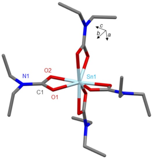 Regarding the solid-state characterization of metal carbamates by single-crystal X-ray diffraction, the area was first reviewed by Calderazzo et al. [] and then recently updated by Marchetti et al. []. To date, numerous examples of metal carbamates have thus been isolated and characterized, demonstrating a rich coordination chemistry and highlighting a great diversity of structures. Herein, we will focus exclusively on X-ray structures involving tin moieties. To the best of our knowledge, six CSD depositions of carbamato tin complexes have been identified up to now (CSD entries and deposition numbers are reported in Table 1).