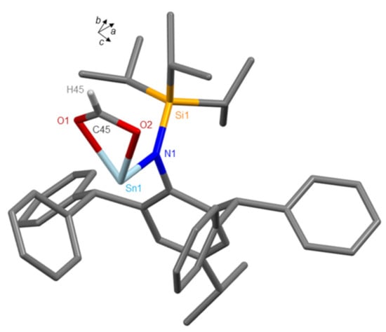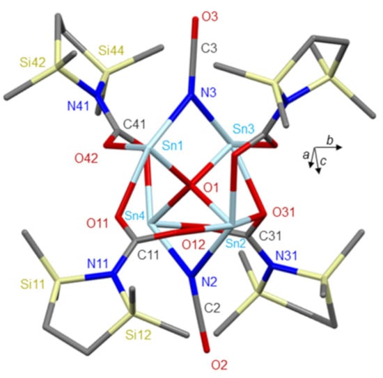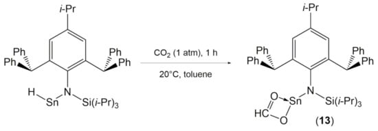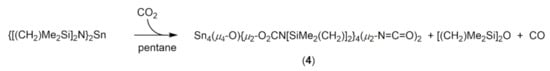 In 2010, Kemp et al. reported the reactivity of bis(2,2,5,5-tetramethyl-2,5-disila-1-azacyclopent-1-yl)tin toward CO2 leading to a silyl-substituted carbamate of tin(II) []. The exposure of {[(CH2)Me2Si]2N}2Sn in solution in pentane under 60 psig of CO2 (4 bar) at room temperature causes a rapid reaction involving a color change from red-orange to yellow. In parallel, GC–MS investigations on the reaction medium have shown the co-formation of carbon monoxide and the cyclic ether 2,2,5,5-tetramethyl-2,5-disila-1-oxacyclopentane, [(CH2)Me2Si]2O (Scheme 13). Sn4(μ4-O){μ2-O2CN[SiMe2(CH2)]2}4(μ2-N=C=O)2 (4) was isolated as single crystals and analyzed by X-ray diffraction analysis. The unprecedented structure of 4 can be described as a tetranuclear tin cluster based on a [μ4-O]Sn4 core and including in periphery two bridging –N=C=O isocyanates and four bridging –O2CN[SiMe2(CH2)]2 carbamato ligands (Figure 3). The presence of the central atom μ4-O was explained as resulting from the cleavage of CO2 and not from O2 or H2O. Furthermore, the reaction of {[(CH2)Me2Si]2N}2Sn was also envisaged with OCS and CS2 leading, respectively, to an insoluble polymeric material and to a trinuclear cluster based on the coordination of three {[(CH2)Me2Si]2N}2Sn moieties by one CS2 molecule acting as μ3 ligand. Previously, during the 1990s, Sita et al. explored already the reactivity of Ge and Sn complexes of silyl-containing amides toward carbon dioxide []. In particular, they focused on the reaction involving [(Me3Si)2N]2Sn with CO2, which led to the isolation of the dimeric bisalkoxide complex, [Sn(OSiMe3)2]2. However, in this case and compared to the Kemp’s report, the tin carbamate is not stable but leads to the formation of [Sn(OSiMe3)2]2, trimethylsilyl isocyanate, and 1,3-bis(trimethylsilyl)carbodiimide, respectively, according to a ligand metathesis process.