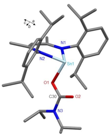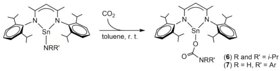 To our knowledge, the latest tin carbamate structure resolved to date by X-ray diffraction is to be credited to Fulton et al., who published in 2011, the reactivity of β-diketiminate tin derivatives with carbon dioxide []. [HC{(Me)CN(2,6-i-Pr2C6H3)}2]SnNi-Pr2 and [HC{(Me)CN(2,6-i-Pr2C6H3)}2]SnNH(2,6-i-Pr2C6H3), dissolved in toluene, react with CO2 (1 atm) at room temperature yielding to the corresponding carbamato tin(II) complexes, [HC{(Me)CN(2,6-i-Pr2C6H3)}2]SnOC(O)Ni-Pr2 (6) and [HC{(Me)CN(2,6-i-Pr2C6H3)}2]SnOC(O)NH(2,6-i-Pr2C6H3) (7), respectively (Scheme 15). In the solid-state, 6 consists of a mononuclear complex describing a trigonal pyramidal arrangement of the ligands around the tin atom and in an endo configuration. The carbamate moiety is terminally O-bonded to Sn [Sn−O = 2.1346(16) Å] and its orientation can be viewed almost perpendicular to the NCCCN plane of the β-diketiminate ligand (Figure 5). This mode of coordination is unusual for carbamates and is similar to that observed in the case of hemicarbonato derivatives []. The X-ray structure of complex 7 has not been reported but the spectroscopic data are very similar to 6 (Table 2) and the authors mention that for both compounds, the insertion reaction is irreversible, even under reduced pressure.